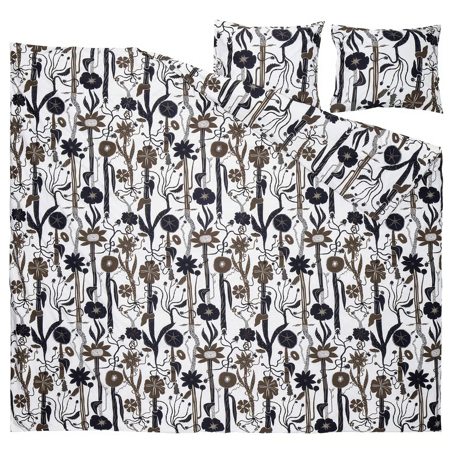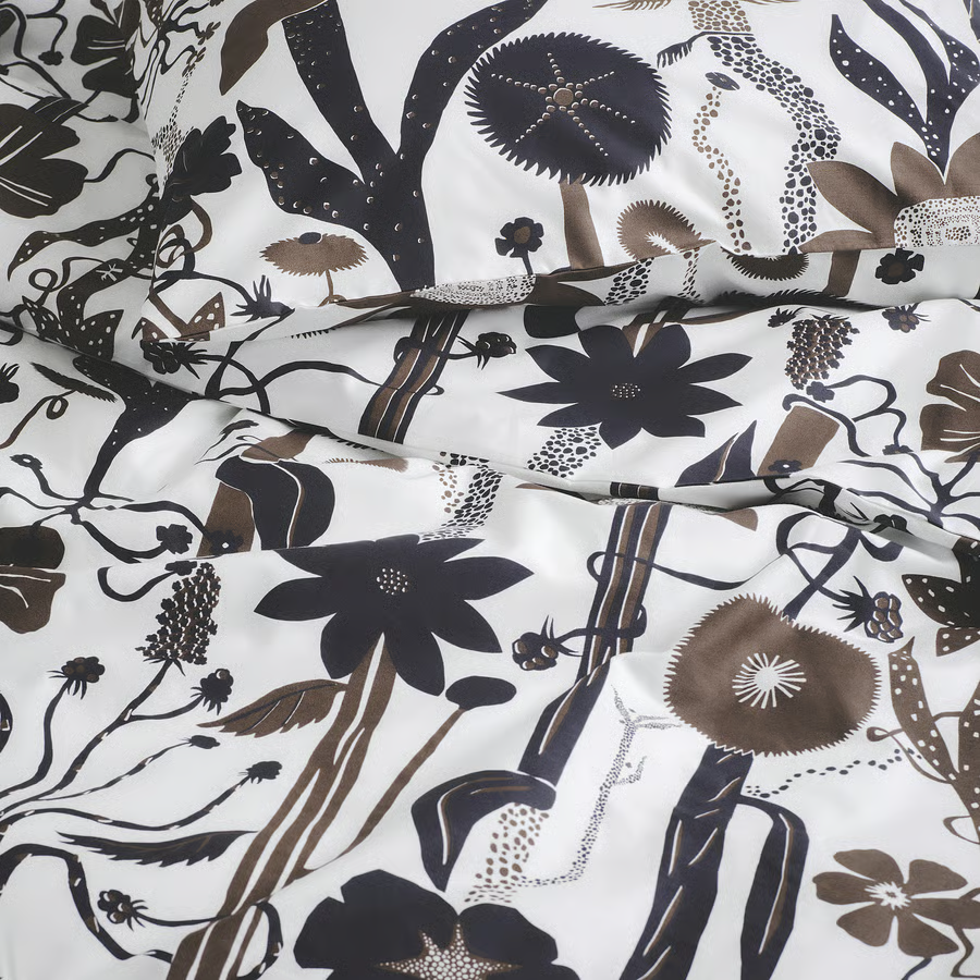 Grafička i razigrana šara sa stabljikama koje stvaraju prugastu šaru iz koje rastu uvijeni cvjetovi i listovi.