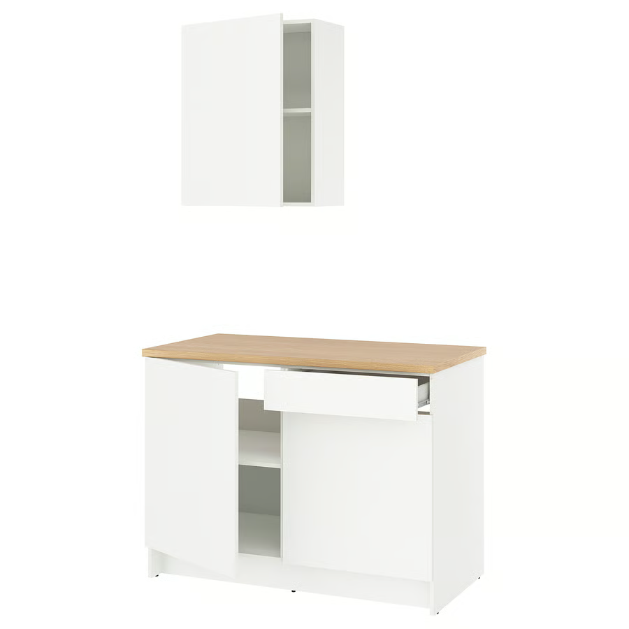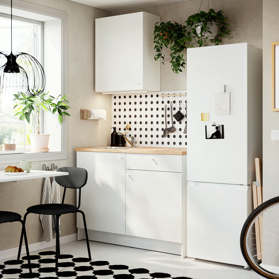 Bjeli frontovi upareni s radnom pločom s imitacijom hrastovine daju kuhinji svjež i bezvremenski izgled koji se lako zavoli.