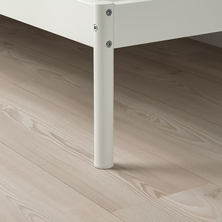 Metal presvučen prahom u bijeloj boji i vidljivi zavrtnji daju ovom okviru za krevet moderan izgled.